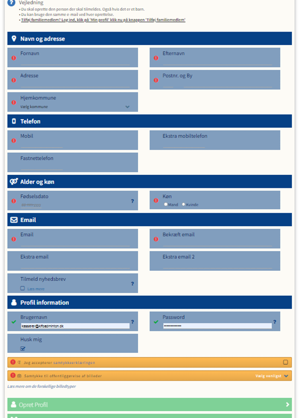 Der skal indtastes navn, adresse, kommune, mobilnummer, fødselsdato og år, køn, mailadresse samt brugernavn og password.